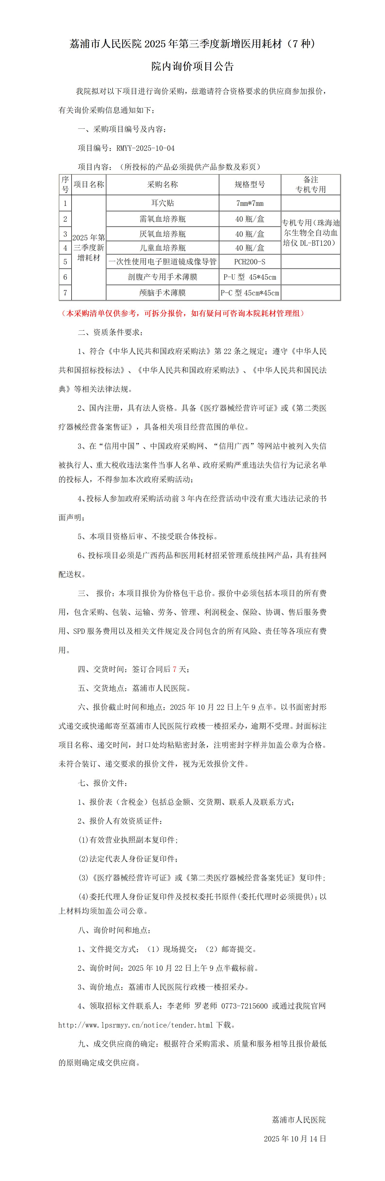 2025年第三季度新增医用耗材(7种)院内询价项目公告
