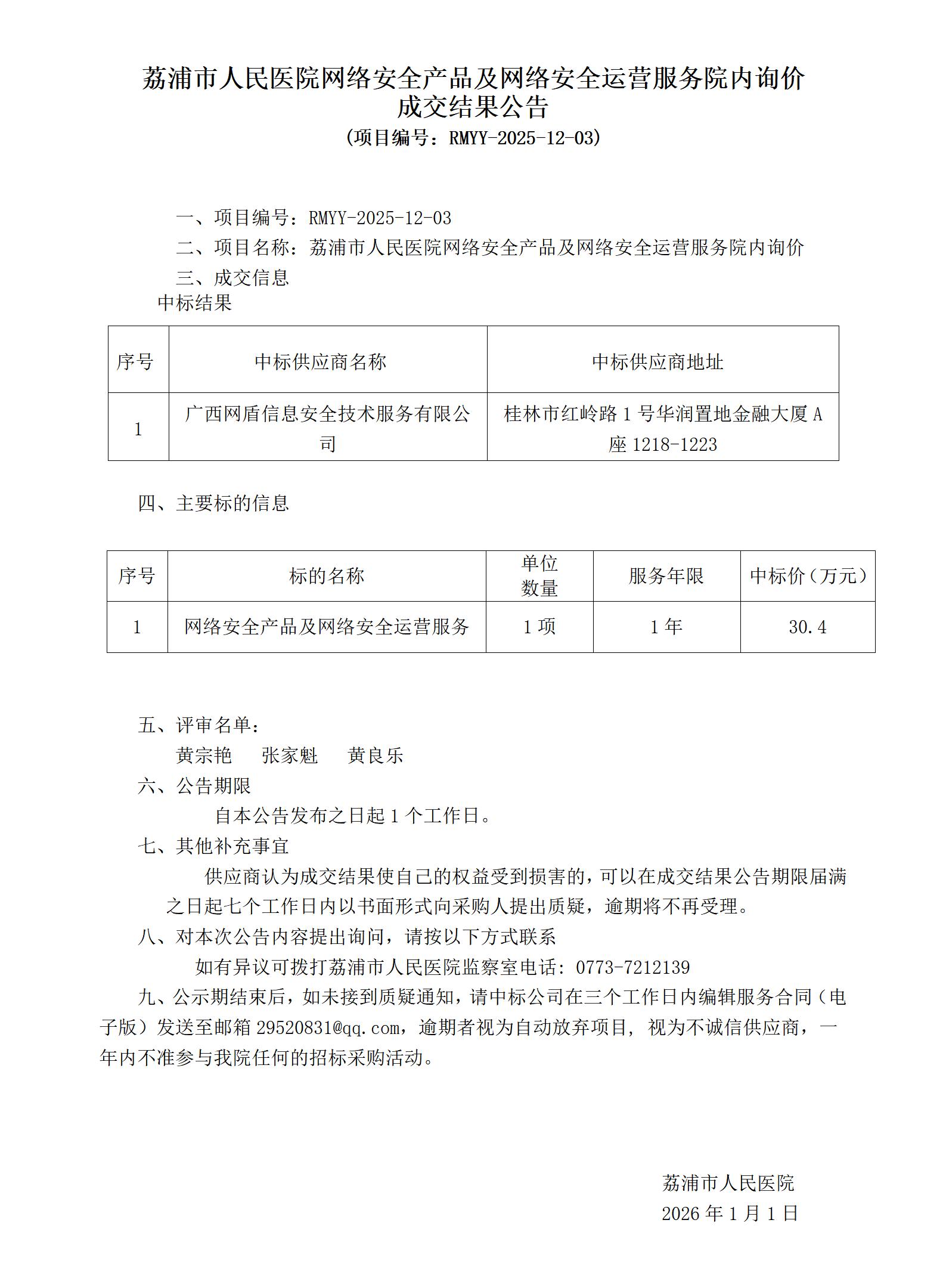 网络安全产品及网络安全运营服务院内询价成交结果公告