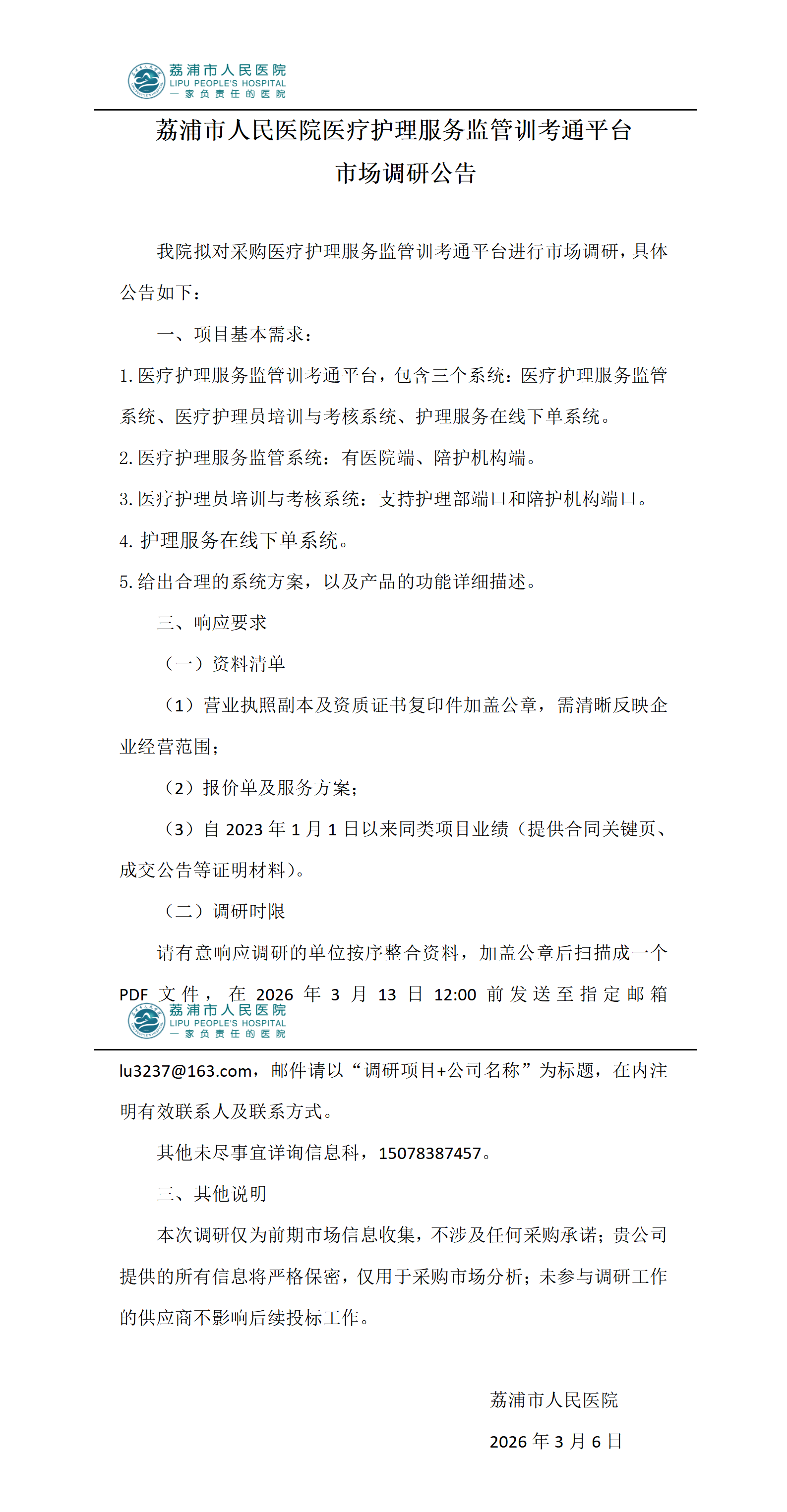 医疗护理服务监管训考通平台市场调研公告