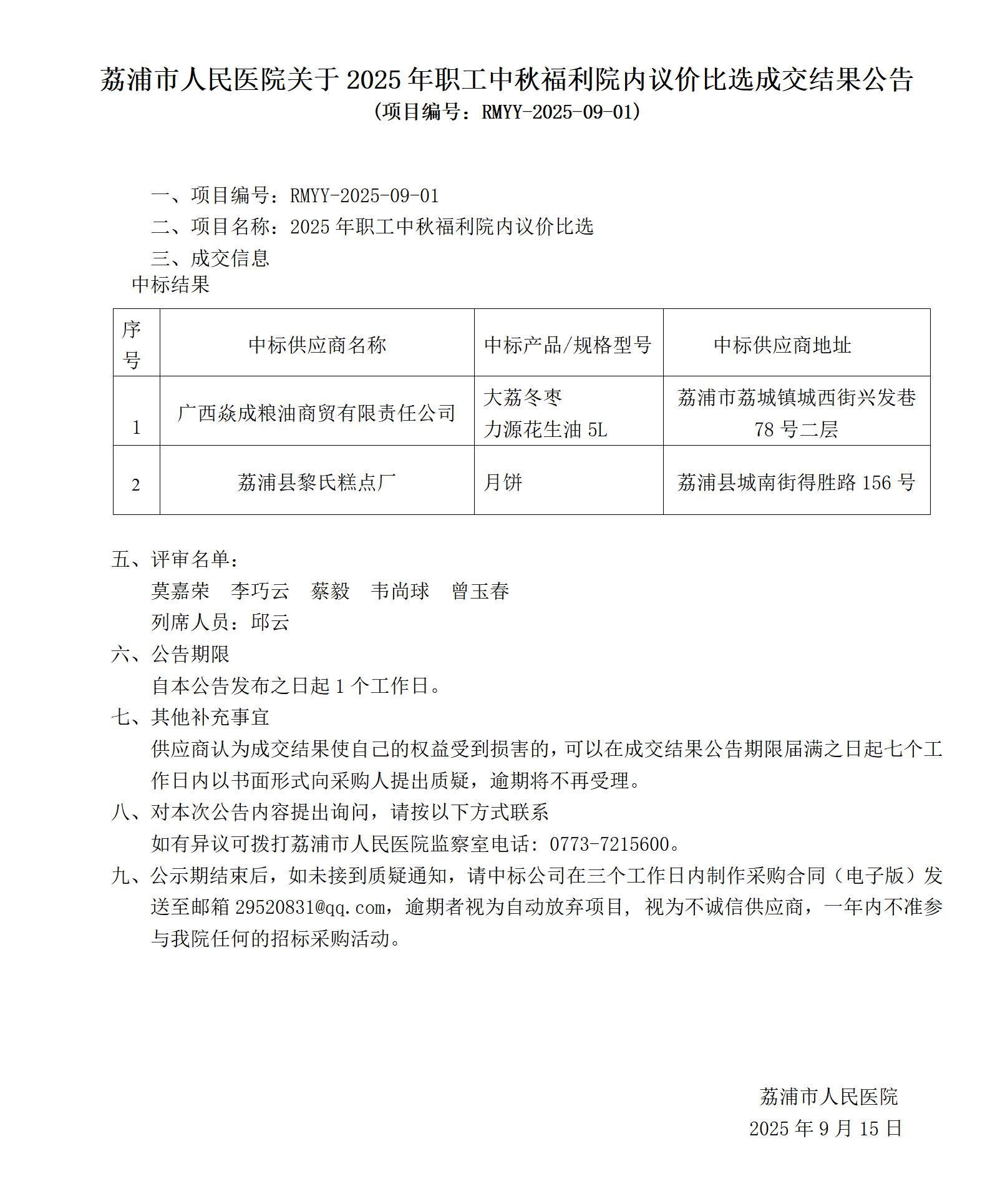 关于2025年职工中秋福利院内议价比选成交结果公告