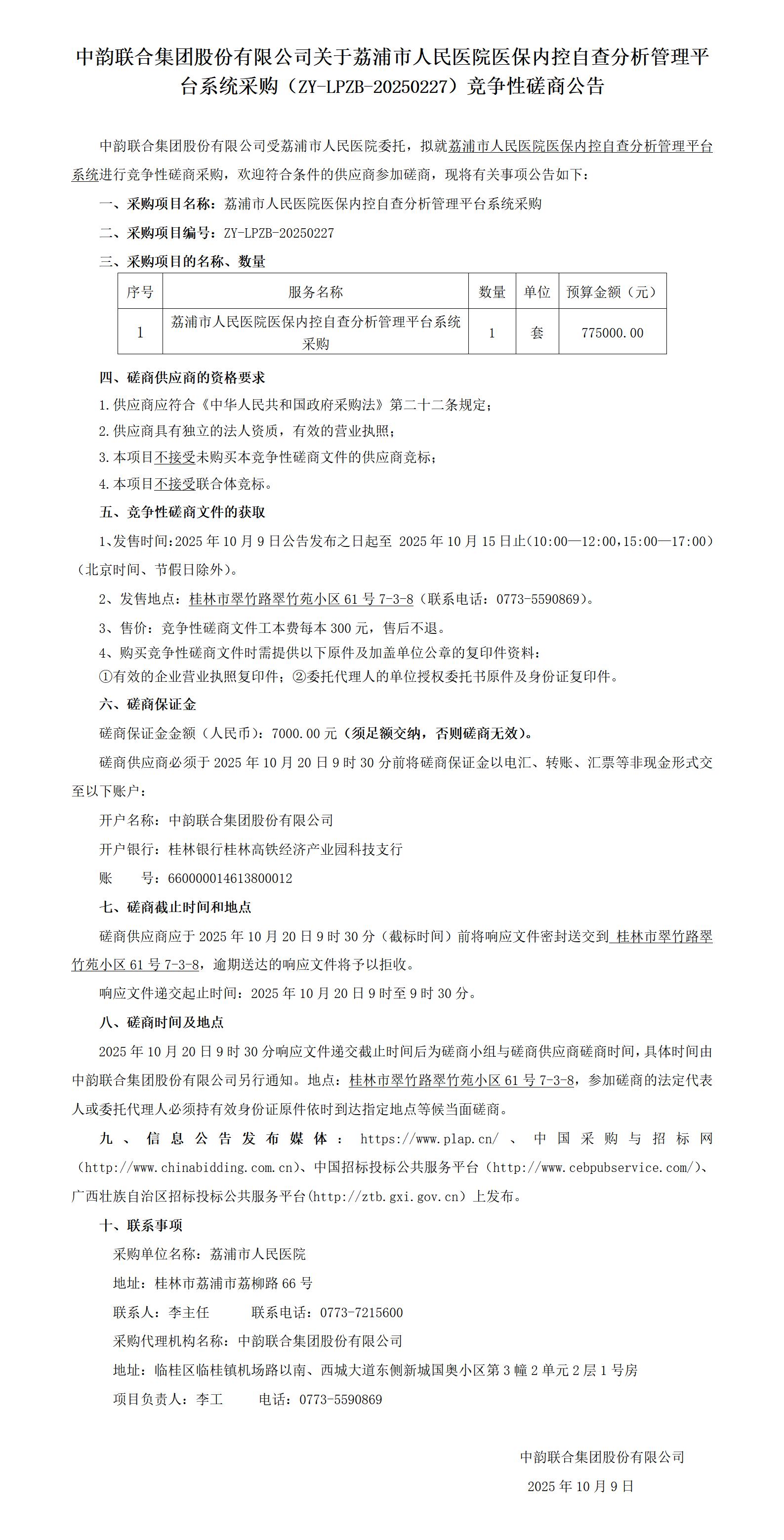 中韵联合集团股份有限公司关于荔浦市人民医院医保内控自查分析管理平台系统采购(ZY-LPZB-20250227)竞争性磋商公告