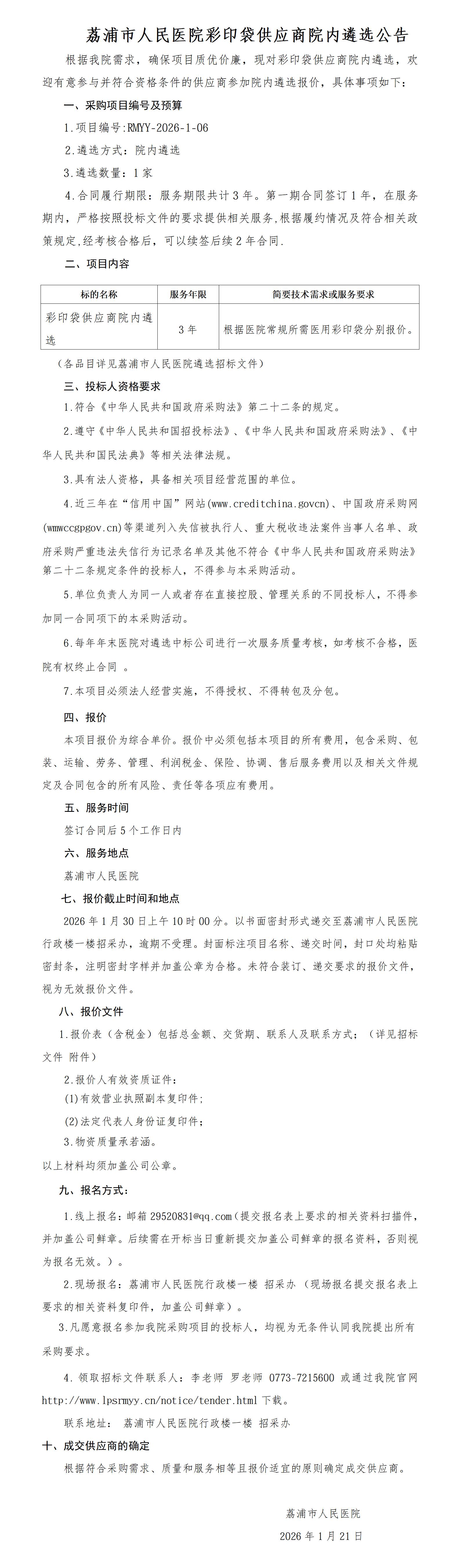 彩印袋供应商院内遴选公告