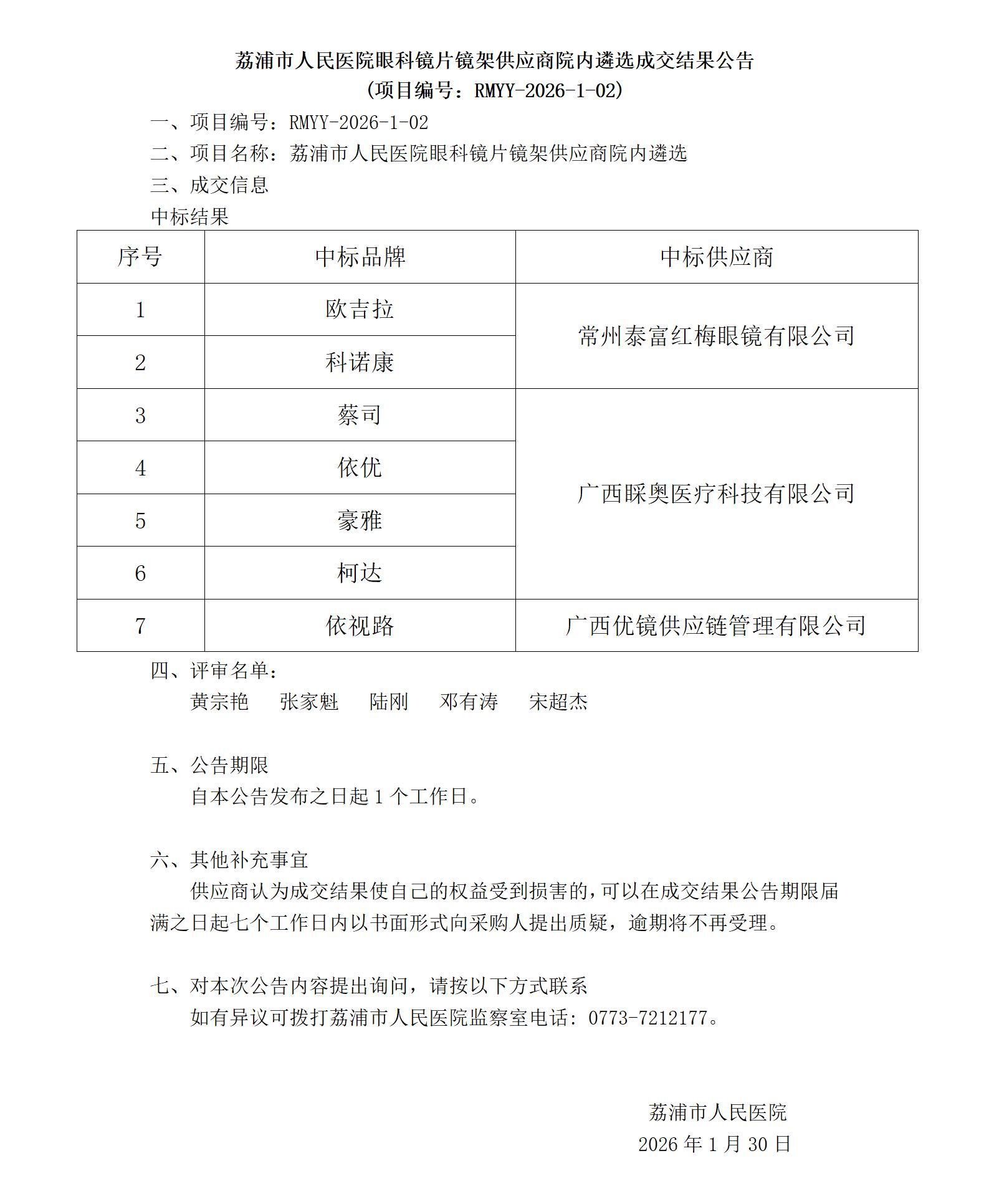 眼科镜片镜架供应商院内遴选成交结果公告
