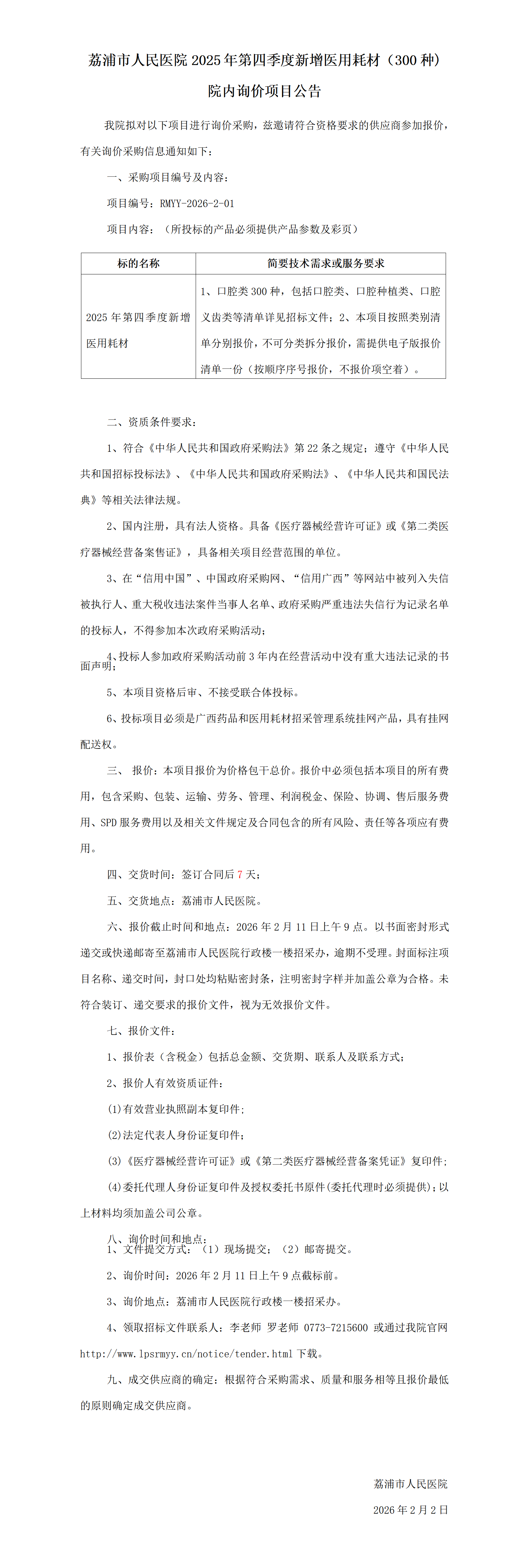 2025年第四季度新增医用耗材(300种) 院内询价项目公告