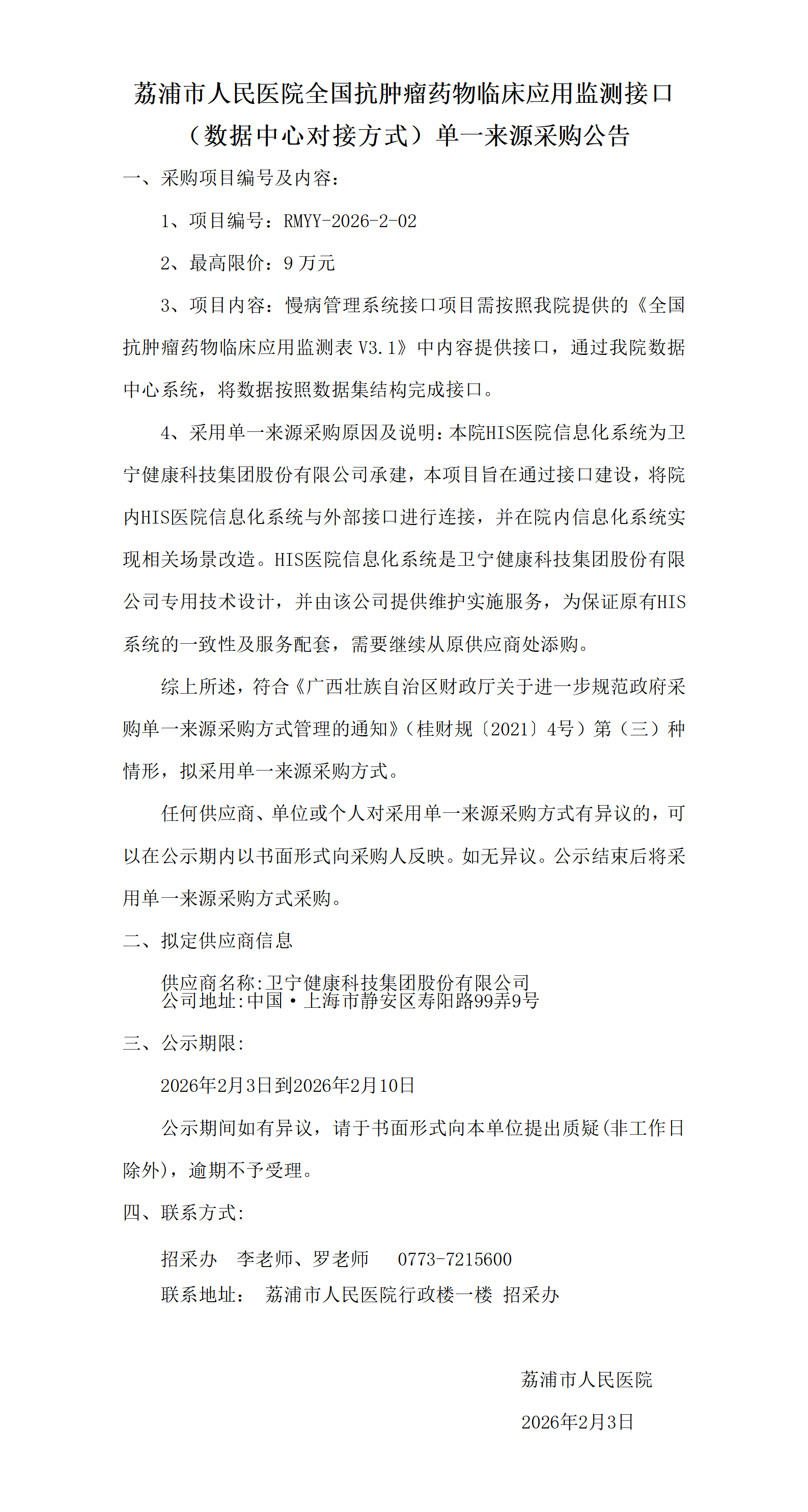 全国抗肿瘤药物临床应用监测接口(数据中心对接方式)单一来源采购公告